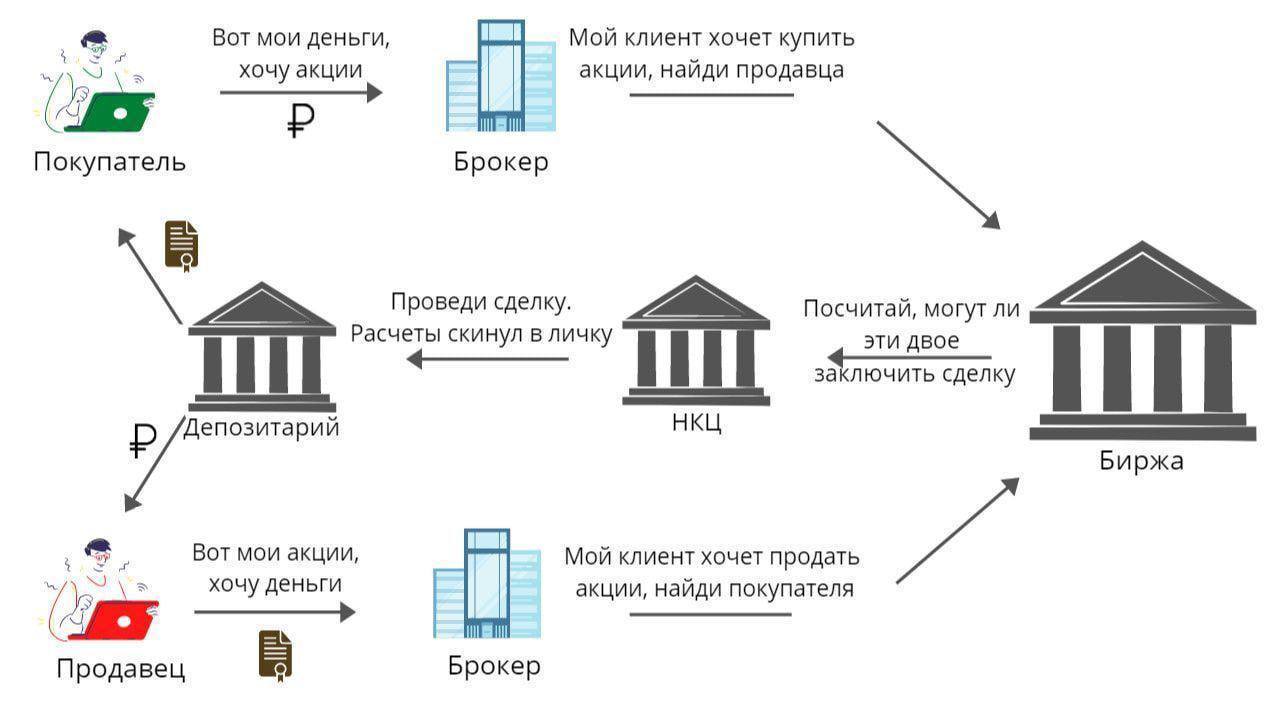 То есть цепочка: я — инвестор хочу продать или купить ЦБ (ценную бумагу), выставляю заявку, брокер сообщает Бирже об этом. Биржа направляет заявку в НКЦ для расчёта, а тот, в свою очередь, просит депозитарий провести денежную операцию с нами.