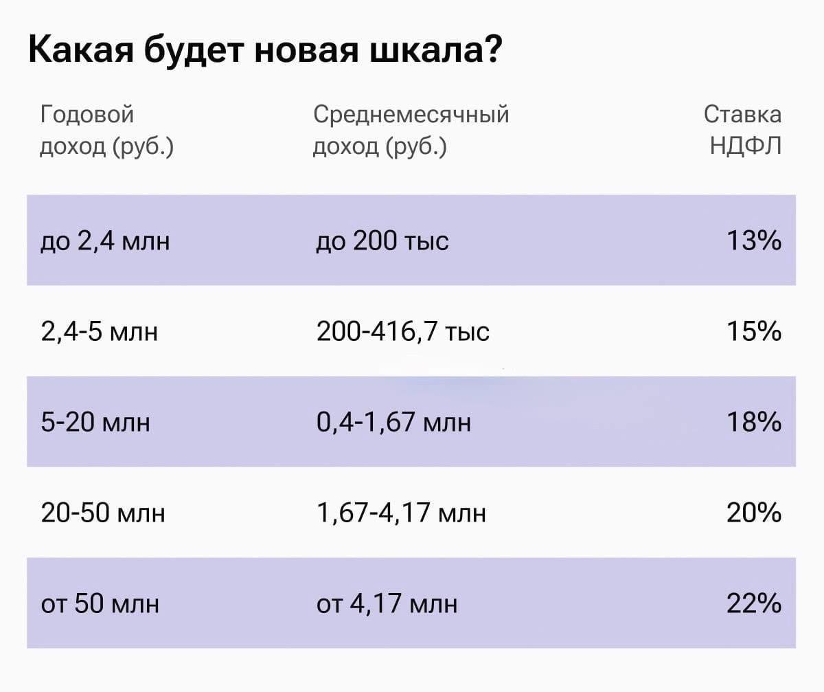 Теперь не 13% и 15%, а прогрессивная шкала, где ставка налога растет вместе с годовым доходом. Главное, что нужно знать: до 2,4 млн рублей в год — 13%, от 2,4 до 5 млн в год — 15% и вплоть до 22% за 50 млн рублей в год. При превышении «порога» новая ставка распространяется только на сумму превышения.